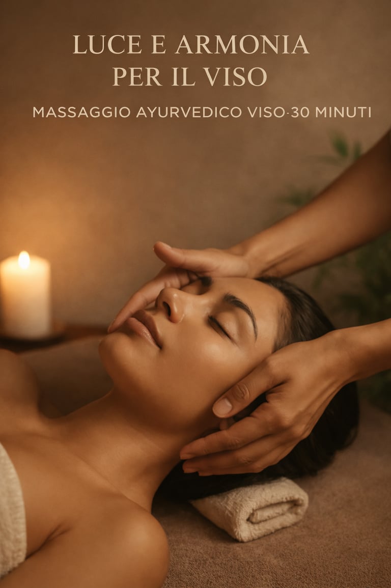 Manualità avvolgenti e oli caldi ayurvedici sciolgono le tensioni del viso, rilassano la mascella, riattivano la circolazione e donano una luminosità immediata.